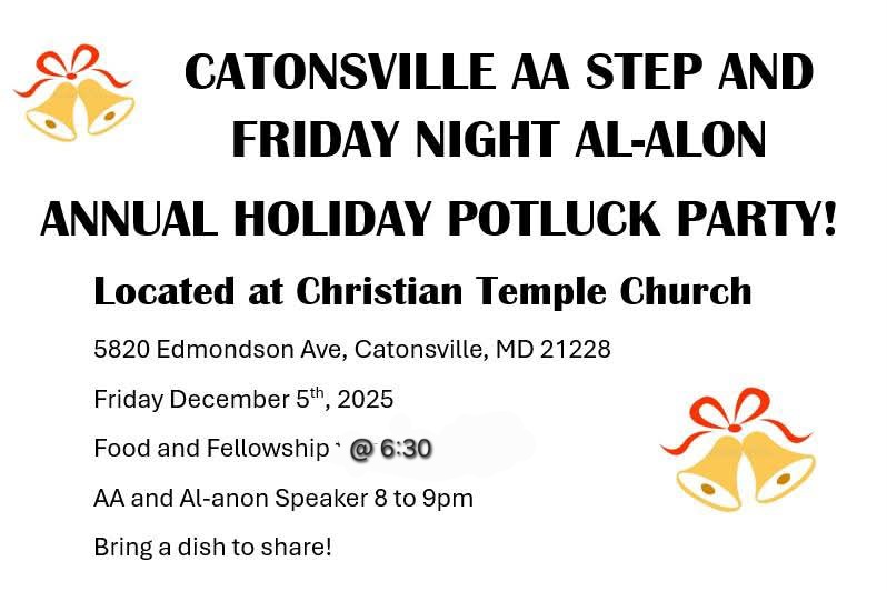 Mark your calendar: Catonsville Friday Night AFG Annual Holiday Potluck Party; bring a dish to share!