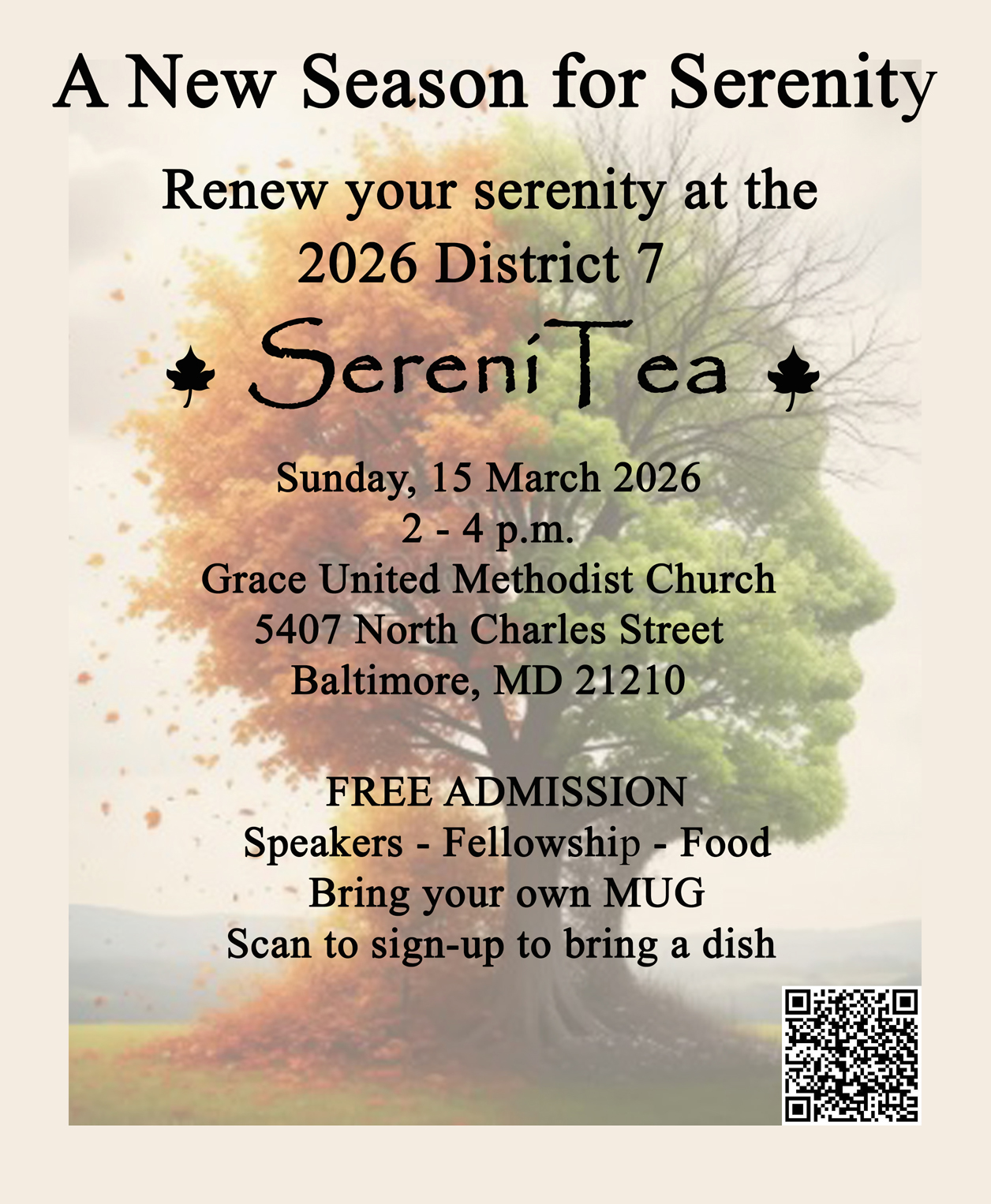 District 7 invites you to the 2026 SereniTea on Sunday, March 15th 2026. Scan the code on the flyer to sign up to bring a dish, and don’t forget to bring your own mug! Renew your serenity with fellowship, speakers and food.